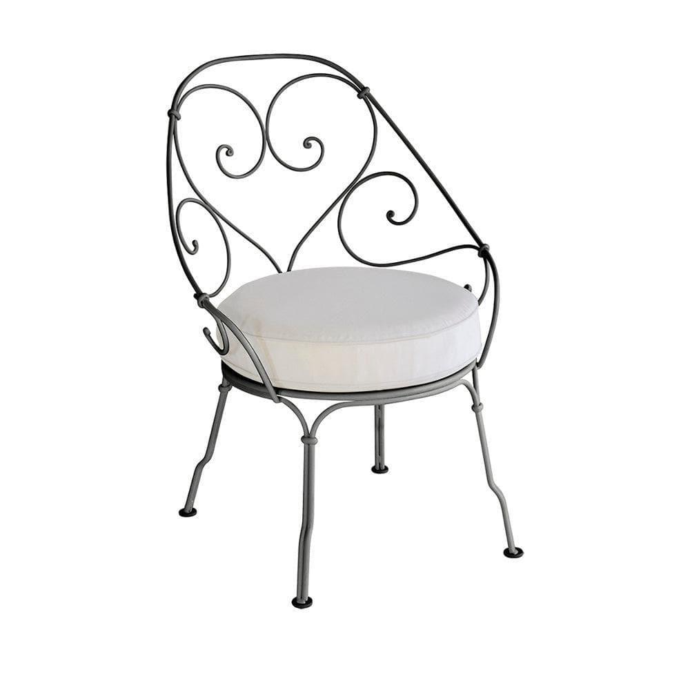 Gestell: Stahldraht Sitzfläche: Perforiertes Stahlblech Rückenlehne: Stahldraht Alle Stücke der Serie sind in 24 Farben erhältlich* Die Polsterkissen gibt es in 3 Farben: Blanc grisé, Gris flanelle und Gris graphite. Sie sind aus waschbarem wasserabweisendem Sunbrella Stoff ( 100% Acryl ) und sehr beständig gegen Sonne, Flecken und Schimmel, Abrieb und Zerreissen. Das Polster besteht aus 75mm hohem PU Schaum mit hoher Dichte, um den Komfort zu bewahren. Die Unterseite ist mit einer rutschhemmenden Beschichtung versehen - Privatgebrauch - beruflichen Gebrauch/Horeca - nicht für öffentlichen GebrauchSKU(Artikelreferenz) 2205xx Größe 59,5 x 82,5 x H55,5cm Gesamtgewicht 7.2 kg Material Farbe Beschichtung UV resistente Polyester-Pulverbeschichtung ** Anti-Korrosionsindex 7IPAC Allgemein UV- beständig, Bögen, Armlehnen und Ringe handgeschmiedet. Die Kissen sind am besten im Winter und bei Unwettern innen aufzubewahren, um ihre Langlebigkeit zu gewährleisten. Garantie 2 Jahre Alterungsgarantie, 5 Jahre Funktionsgarantie*** Geeignet für